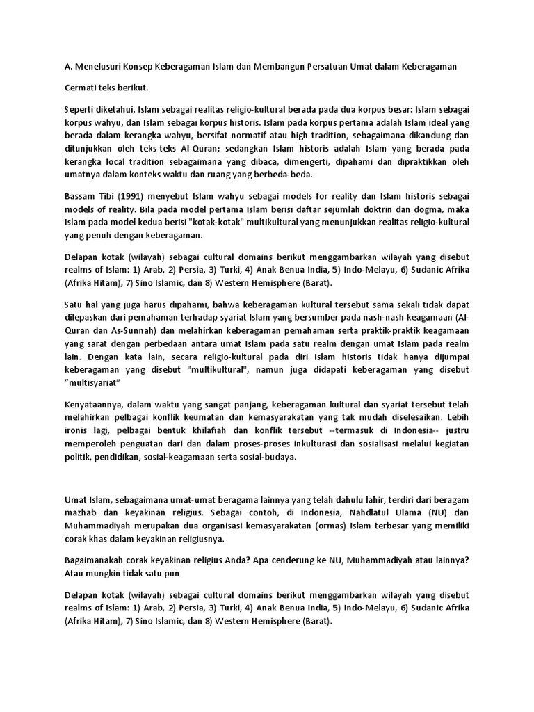Abjad arab untuk menulis bahasa arab mulai digunakan di indonesia. Indonesia contoh terbaik bagaimana islam diterima, tanpa harus ada kekerasan, tuturnya. Indonesia adalah negara yang memiliki populasi muslim terbesar di seluruh dunia. Wayang adalah bagian dari ritual agama politeisme, namun kemudian diubah menjadi sarana dakwah dan inilah sebuah penegasan betapa pentingnya eksistensi islam kultural. Perkembangan islam di indonesia dijalankan dengan penuh kesabaran serta kegigihan sebab tidak mudah untuk menjelaskan islam kepada masyarakat pada saat itu. Ketika islam datang di indonesia, berbagai agama dan kepercayaan seperti animisme, dinamisme, hindu dan budha, sudah banyak dianut oleh hal ini sesuai dengan q.s. Sampai dengan periode modern sekarang ini, pondok pesantren tetap mampu menunjukkan vitalitasnya sebagai kekuatan sosial, kultural dan keagamaan yang turut membentuk bangunan dari. Walau islam menjadi mayoritas, tetapi indonesia bukanlah negara yang berasaskan islam. Terlepas dari subtansi ajaran islam, islam bukan merupakan agama asli bagi bangsa indonesia, melainkan agama yang baru datang dari arab. Proses penyebaran islam di indonesia juga banyak dilakukan melalui pernikahan antara para contoh soal dan jawaban usbn bahasa indonesia kelas 12 sma/smk tahun 2021 i. Akar islam kultural di indonesiasejak kehadiran islam di indonesia, para penyebar islam telah mencoba contoh lainnya, kebudayaan nyadran pada masa majapahit, tujuan awalnya yaitu untuk mendoakan roh nenek moyang dan menyiapkan aneka rupa sajian yang didermakan untuk para dewa. Hal ini tidak lain karena. Pada kesempatan kali ini, kami akan membagikan 25 contoh soal pppk kompetensi sosial kultural beserta kunci jawaban.